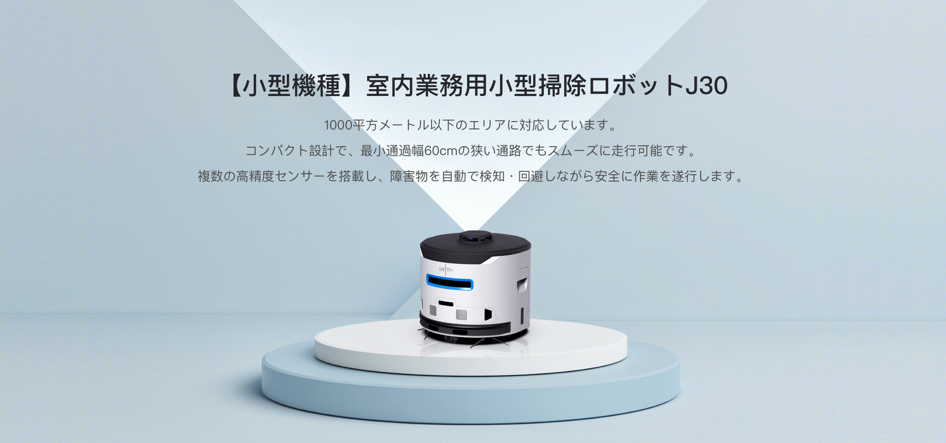 J30はコンパクトながら、水拭きと吸引を同時に行える業務用清掃ロボット。狭い通路や店舗の清掃に適しており、省スペース設計でも高い清掃能力を発揮。セルフクリーニング機能を搭載し、常に衛生的な清掃が可能です。