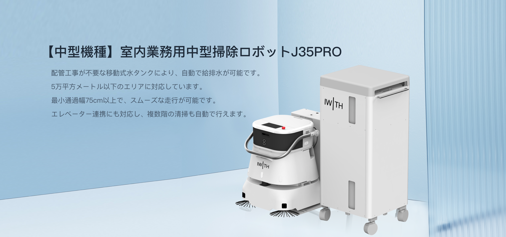 J35PROは、業務用清掃ロボットの最上位モデルとして、水拭き・吸引の同時作業やエレベーター連携、移動式水タンクを搭載。強力な吸引力と広範囲の清掃能力を備え、商業施設や大型オフィスビルなど、大規模な清掃業務にも対応します。